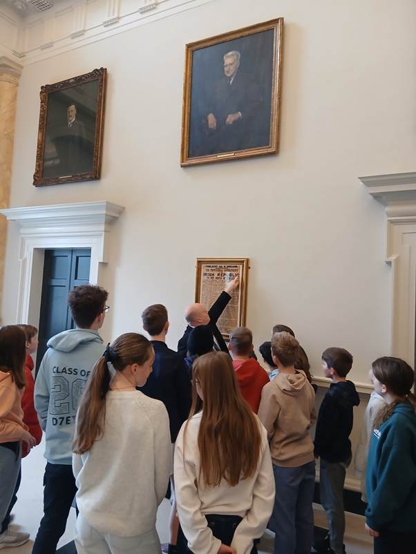 Niamh’s 6th Class recently enjoyed a memorable and educational trip to Leinster House. The class was kindly invited by TD Marie Sherlock, who welcomed us and spent time speaking with the children about her work and the role of government in Ireland. During the visit, we had the opportunity to ask Marie Sherlock questions about the projects and initiatives she is currently working on. The discussion gave the class a valuable insight into how representatives work on behalf of the public and how decisions are made that affect communities like Dublin 7 across the country. The class also took part in a guided tour of Leinster House. They visited the Dáil chamber and the Seanad chamber and were particularly interested in seeing the portraits of past Taoisigh and learning about the leaders who have shaped Ireland’s history. One of the highlights of the visit was viewing the Proclamation of the Irish Republic.