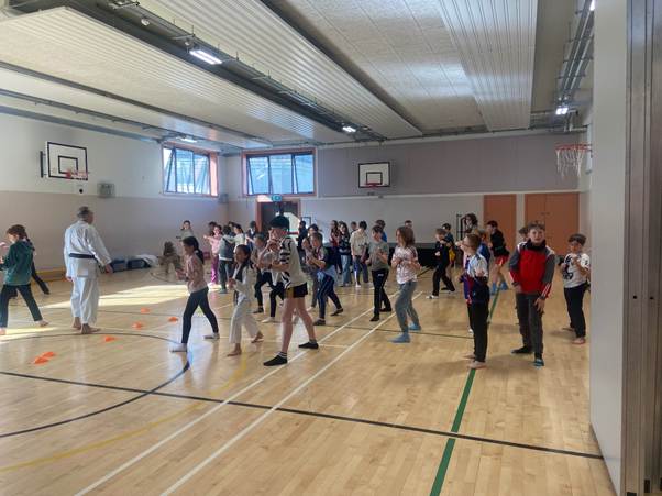 On Wednesday, for PE both 5th classes took part in an introductory karate lesson with Sensei Jimmy. We learned how to punch, kick, bow and show respect. We even learned some Japanese words. We had lots of fun!