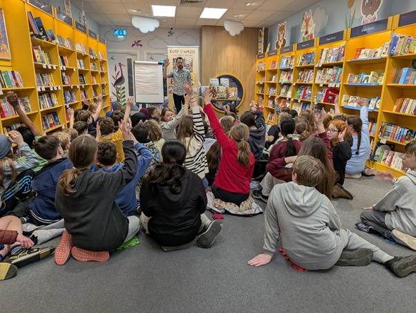 4th class went to Dubray books on Tuesday to meet author and illustrator Paddy Donnelly. He read us his new book “Upside Down Lighthouse”. We learnt that it is based off a real upside-down light house on Rathlin Island! Hughie in 4th class was lucky enough to be chosen to have a story written about him by Paddy. Then we all wrote and shared our own stories. It was a great day.