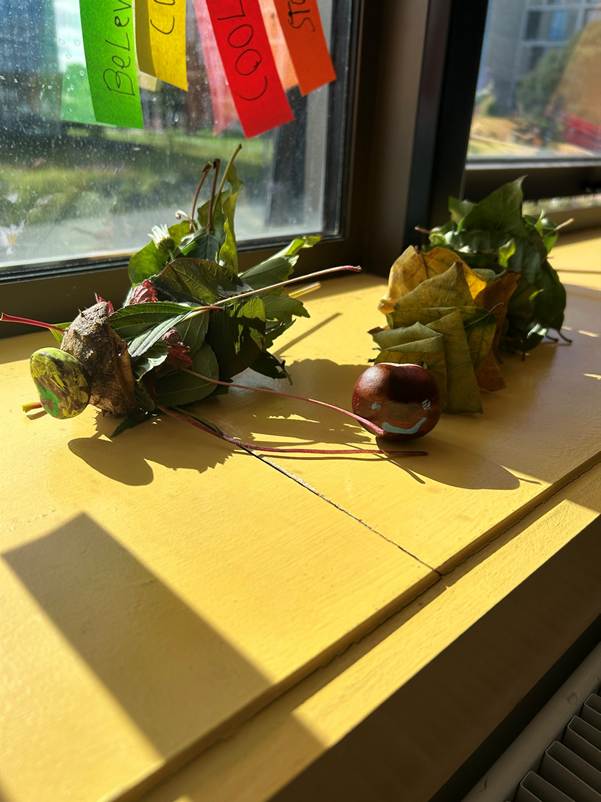 We made leaf creatures from any natural materials we could find in the environment in Grangegorman. Luckily there were lots of different coloured leaves and conkers to choose from. We threaded them onto wooden skewers and then drew faces on them to make them even more individual.