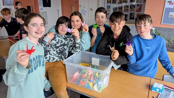 Enda’s 6th class folded 1,000 origami cranes to honour the child victims of the Hiroshima bombing 80 years ago in 1945. To achieve their goal the class enlisted the help of their pals in the other 6th classes.  According to Japanese tradition, folding 1,000 cranes symbolizes a wish for healing and peace. Once completed, the paper cranes were sent to Hiroshima and they have now arrived at the International School there. They will place them at the Children’s Peace Monument in the Hiroshima Peace Park on our behalf, contributing towards the 10 million cranes received each year from children around the world in a powerful gesture of remembrance.
