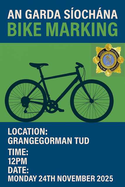 An Garda Síochána have kindly offered to visit the school to do bike marking as well. I will let you know once a date has been confirmed.